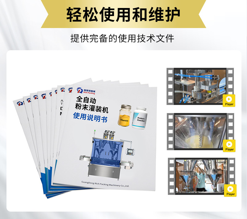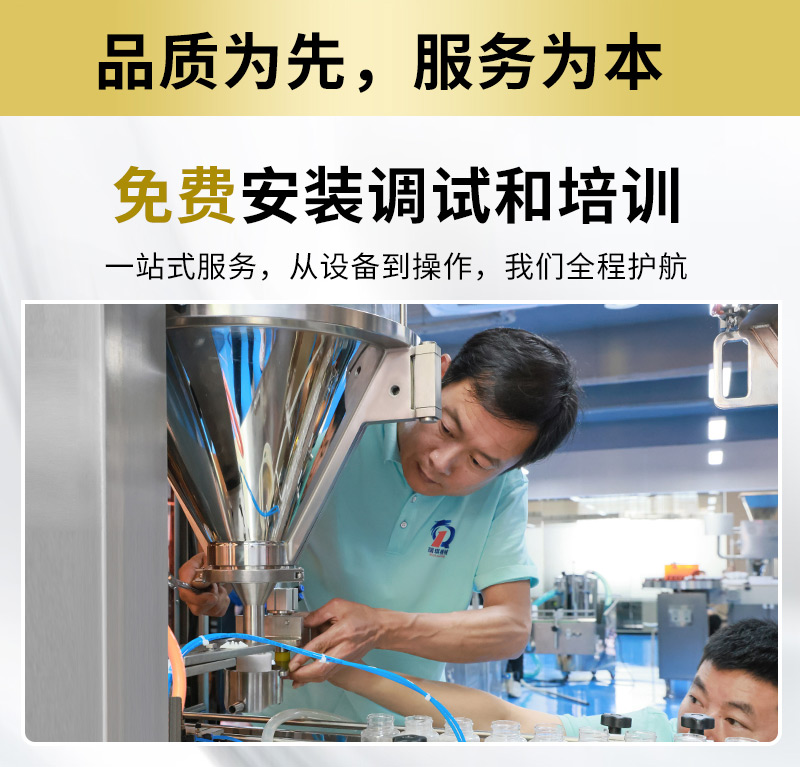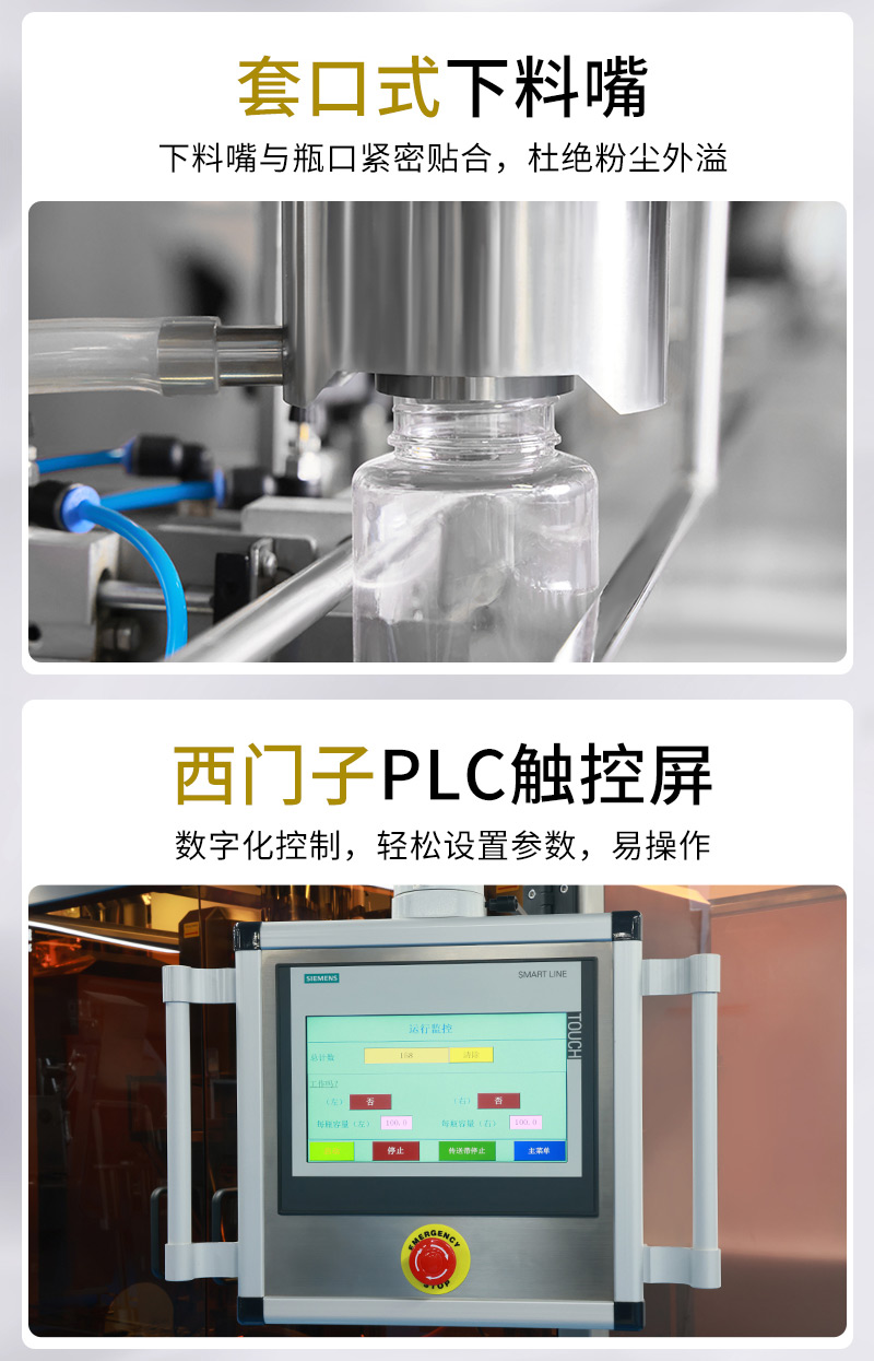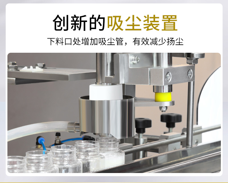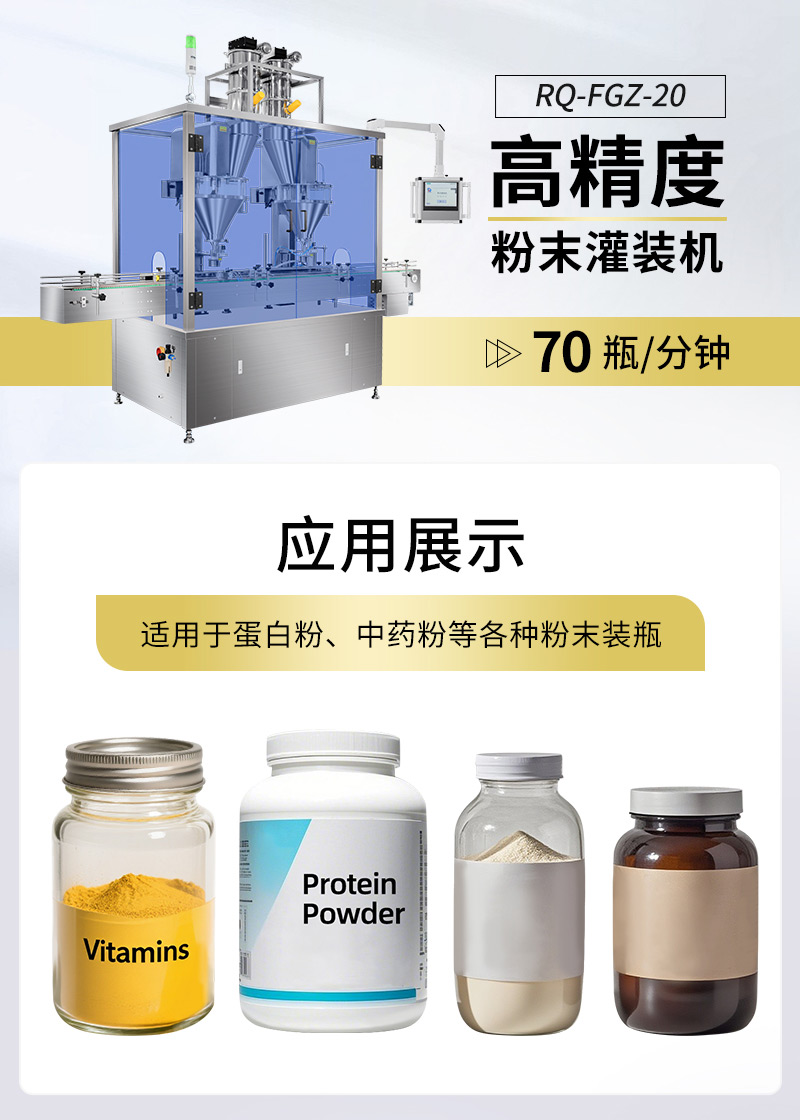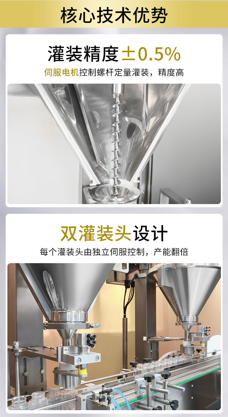 全自动粉末灌装机采用螺杆灌装下料,伺服电机控制,装量精度高。药粉自动灌装机采用PLC与触摸屏控制,支持快/慢两速喂料,实现高精度定量;食品粉末灌装机整机304不锈钢,符合GMP/食品卫生要求,配全密封料箱,拆洗便捷、粉尘不外泄;粉末灌装装瓶机适用于食品/医药/化工等行业的粉末、颗粒定量装瓶,典型计量10–500g、精度±1%、速度约4200瓶/小时(视型号与物料而定);颗粒粉末灌装机可与理瓶机/上料机/旋盖机/贴标机组成全自动灌装线,支持配方存储,便于切换品种与快速换产。