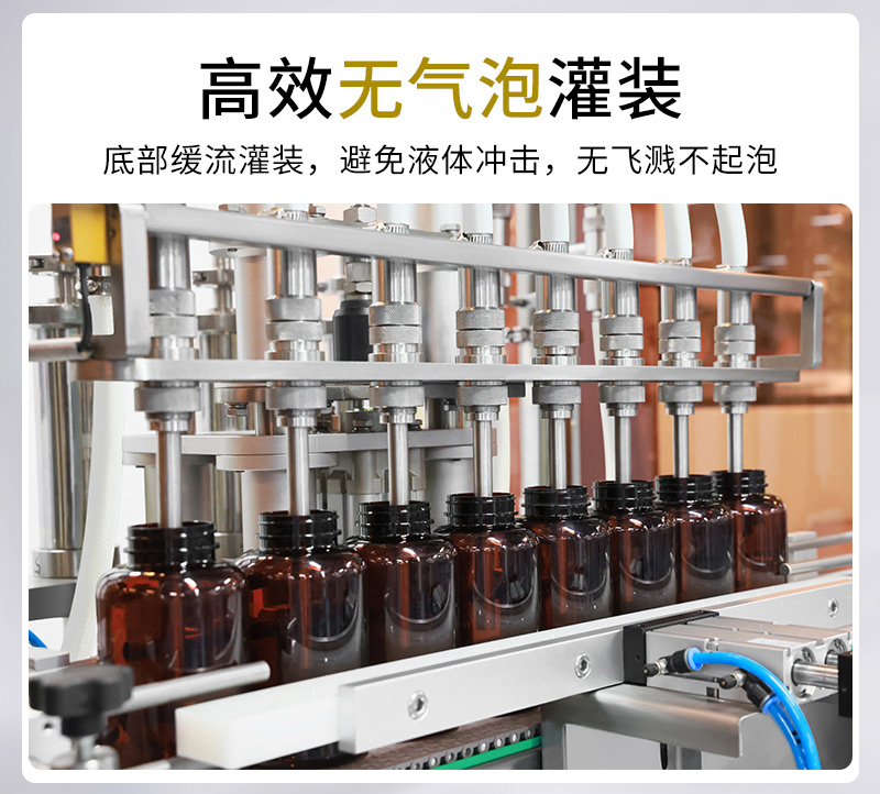 全自动液体灌装机融合活塞式与流量式计量技术,适配食品、饮料、化妆品、制药等多行业液体灌装需求,以精准高效稳定成为生产线核心设备。该口服液液体灌装机采用PLC与触摸屏联动控制,支持多段调速灌装及缺瓶止灌保护,结合光电传感器与伺服驱动实现动态定位与恒速注液。此液体灌装设备整机选用食品级不锈钢与耐腐蚀密封件,满足卫生安全与GMP规范,配备防滴漏灌嘴与回吸系统减少残留与污染。此款自动液体灌装机可处理水剂、油剂、膏体及低黏度液体,灌装范围10ml至500ml,精度可达±0.5%,速度60瓶/分钟。模块化结构与快换接口方便与旋盖机贴标机联线,组成完整全自动液体灌装生产线,提升产能与一致性。