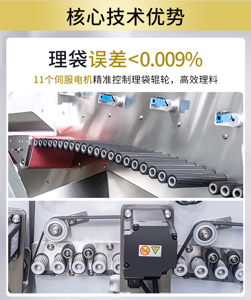 该全自动理袋数袋机采用全伺服驱动系统,11个伺服电机通过智能运动控制器精确协调,实现从储料、上料到分料、剔废的全流程自动化。高速铝塑药板理袋机配备多层级动力上料结构,料仓底部无残留,300L大容量储料仓采用低平台设计,加料便捷高效。创新的防叠料装置和实时检测系统确保运行过程中叠包率低于0.009%。条包理袋机辊轮采用进口低噪齿轮传动,运行噪音控制在63分贝以下。小袋无循序理袋机数袋机支持铝塑板和各类软硬袋装物料处理,可处理尺寸185×110mm,可完美对接后续装盒或装箱工序。