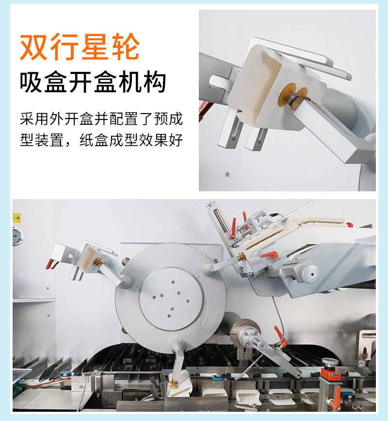 融合前沿技术与自研成果的320W卧式装盒机,严格遵循GMP生产标准。全自动折盒装盒机可对多种物料,如药品铝塑板、颗粒袋、瓶子、软管等实现全自动快速装盒。自动装盒机的机身材质稳定,耐腐蚀且无毒无害。高速药品装盒机采用独特的旋转式四等分双行星轮外开盒结构,搭配预成型装置,提升纸盒成型效率。创新推料设计方便操作维护,全伺服震动落料技术,下料速度与精度表现出色。自动装盒机器还可与泡罩包装机、枕包机等连线,提高车间自动化水平。