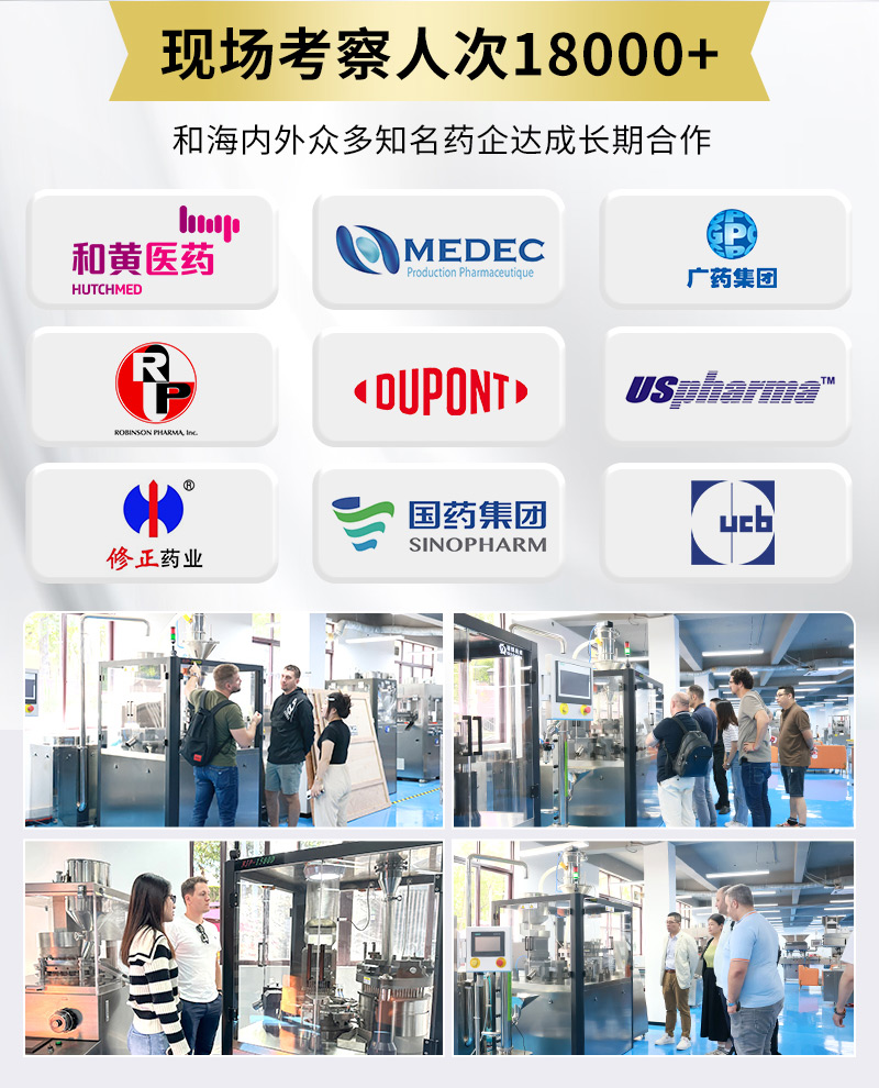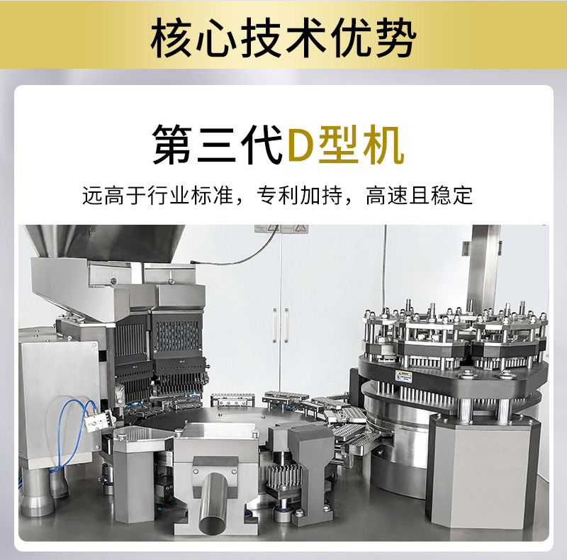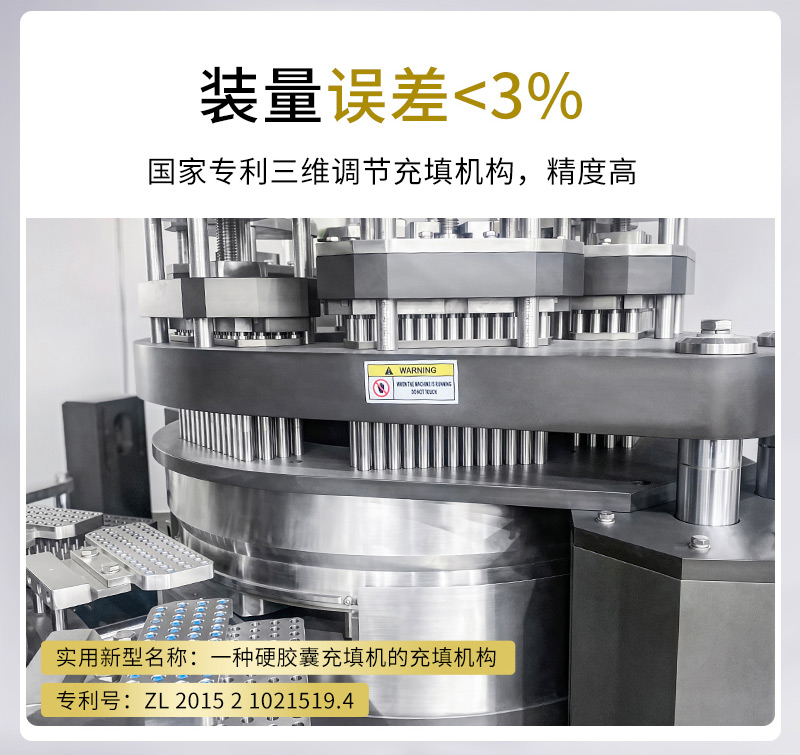 NJP-7800D大型胶囊充填机核心的分度机构采用德国3秒蔡司光学分度头,分度轴一次性加工完成,分度精准,从而保证了极高的装量精度,误差不超过3%。全自动胶囊填充机设备的内槽凸轮由CNC加工中心一次成型,无拼接无缝隙,结构坚固,运行平稳,即使在高速生产中也保持低噪音。制药胶囊机其转盘设计采用进口硅胶密封圈,有效阻挡药粉侵入内部机构,密封性卓越,无任何粉尘溢出。自动胶囊灌装机的充填杆夹持器采用创新的抽拉卡槽设计,使得更换不同型号充填杆或整套模具非常便捷,可在15分钟内完成,极大减少了停机时间,提升了生产效率与灵活性。