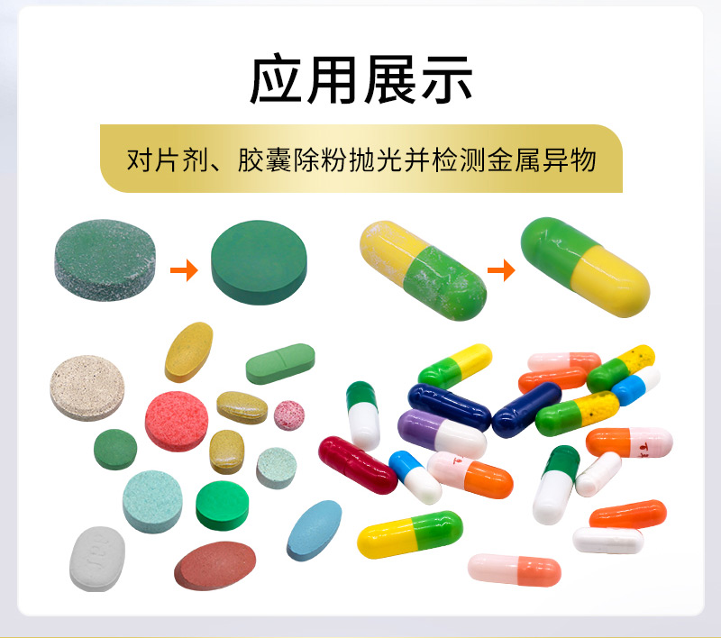 产品功能:对片剂、胶囊进行除粉抛光,并检测是否含有金属异物