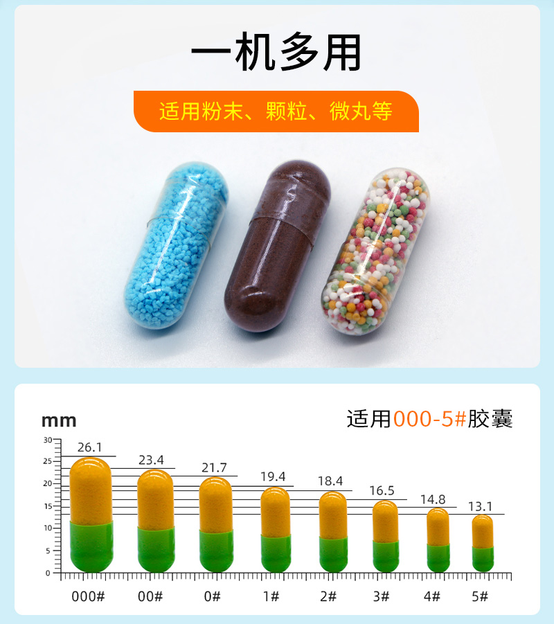 产品功能:将粉末、微丸或颗粒充填到空心硬胶囊