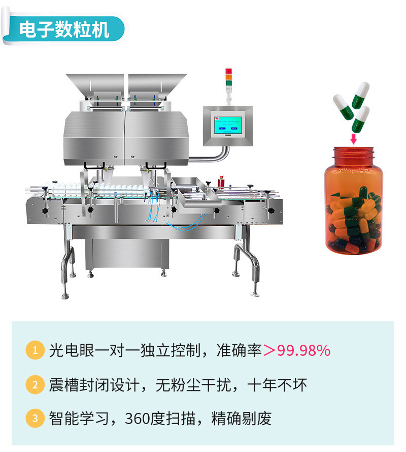 产品功能:适用于片剂、胶囊、丸剂、糖果等,计数装瓶整条生产线