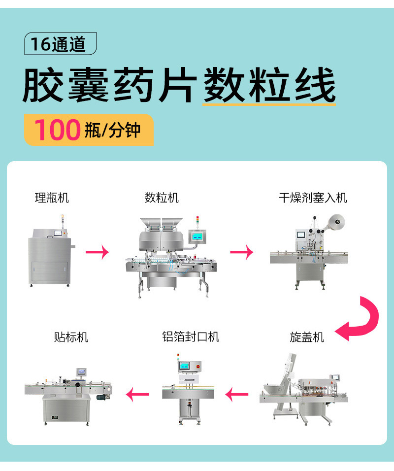 16通道高速数粒瓶装生产线是一款集自动理瓶机、高速电子数粒机、干燥剂塞入机、旋盖机、铝箔封口机、贴标机于一体的全自动固体制剂包装设备。高速数粒机采用16条独立振动轨道并行作业,配合矩阵式光电扫描识别技术,实现对片剂、胶囊、丸剂等颗粒的精确计数,计数精度高达99.97%以上,生产速度可达40-100瓶/分钟。全自动理瓶机将杂乱空瓶自动整理成瓶口朝上状态,高速旋盖机采用伺服扭矩控制确保旋盖松紧度一致,电磁感应铝箔封口机确保瓶口密封防潮。该生产线采用模块化设计,各单机可独立运行也可联动控制,整线符合GMP规范,适用于制药、保健品、食品等行业的大批量瓶装生产需求。