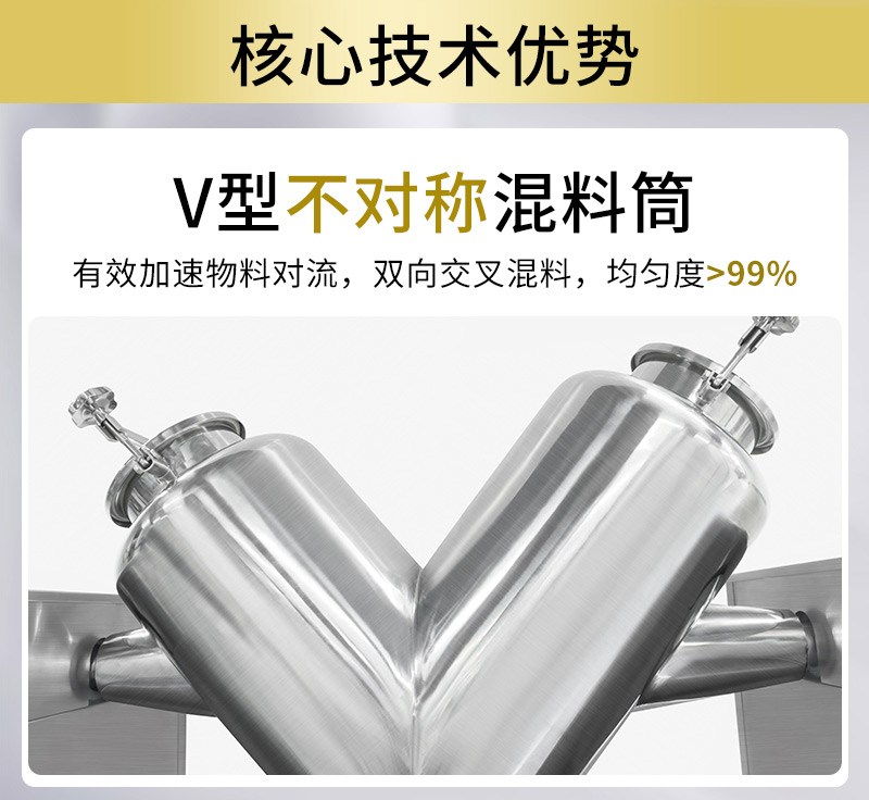 V型混合机采用独特的V型筒体结构,通过筒体旋转使物料在V型腔内不断分合、对流,实现快速均匀混合。这款V型物料混合设备采用不锈钢材质制造,筒体内壁镜面抛光,无死角设计,符合GMP卫生标准。粉末颗粒混合机配备减速电机驱动,运行平稳,噪音低,混合时间可调。全自动V型混料机设备出料口采用气动或手动阀门,出料方便,无残留。整机结构紧凑,占地面积小,操作维护简单。干粉颗粒V型混合机适用于制药、食品、化工等行业的粉状、颗粒状物料的均匀混合,混合均匀度高,是中小批量生产的理想混合设备。