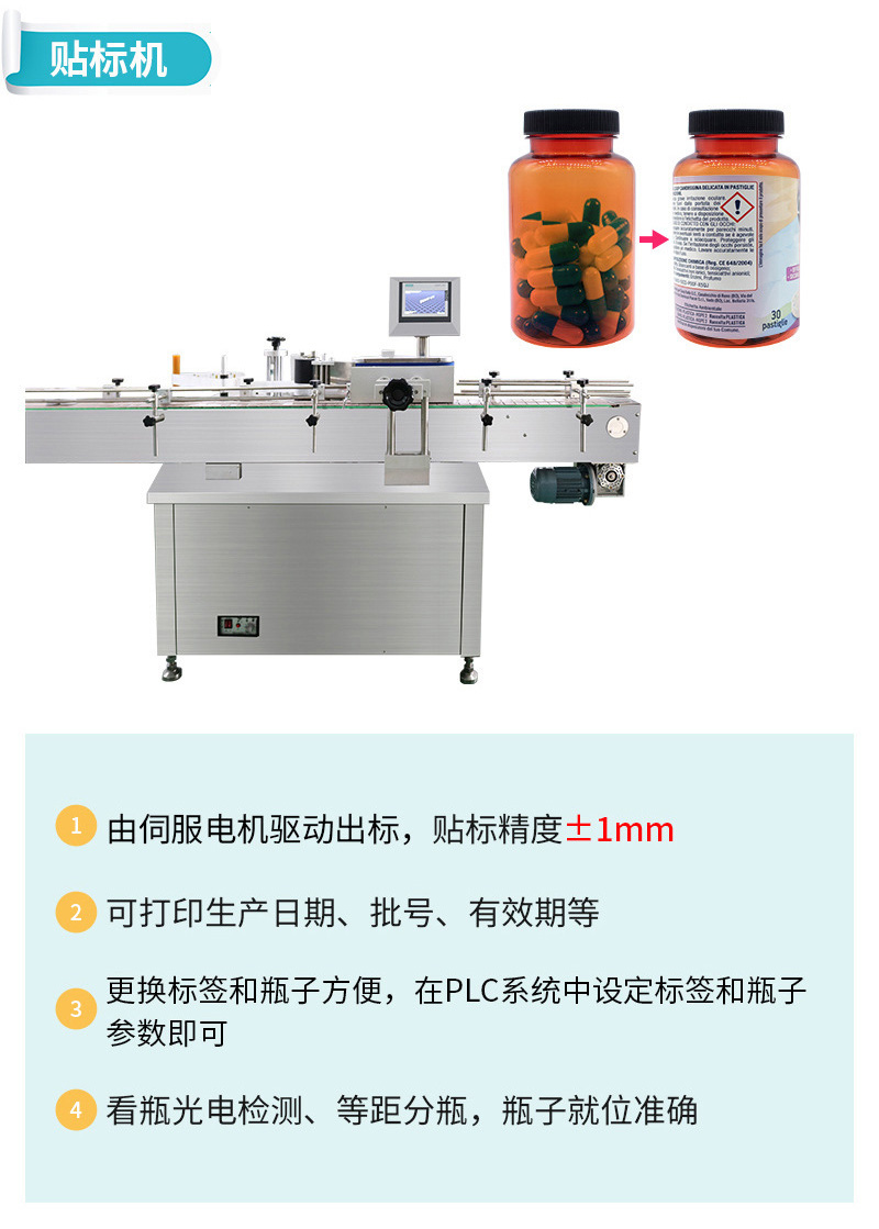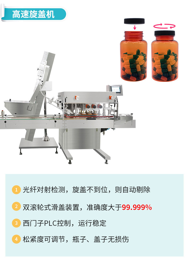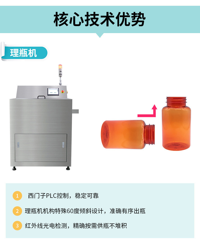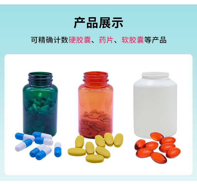 产品功能:适用于片剂、胶囊、丸剂、糖果等,计数装瓶整条生产线