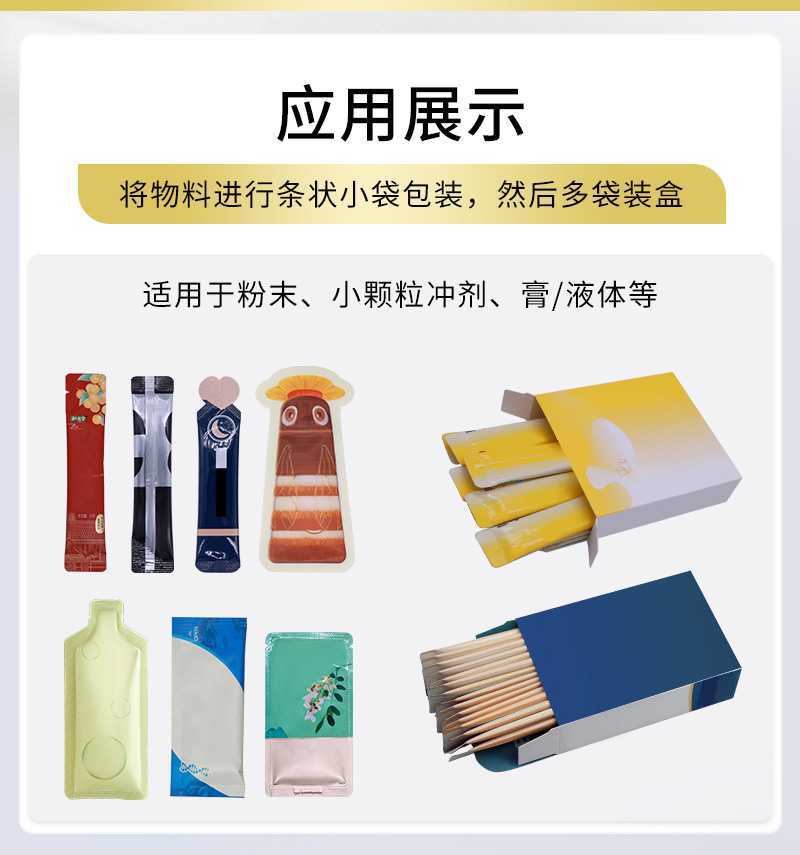 产品功能:对物料进行条形小袋包装后,再多袋装盒机