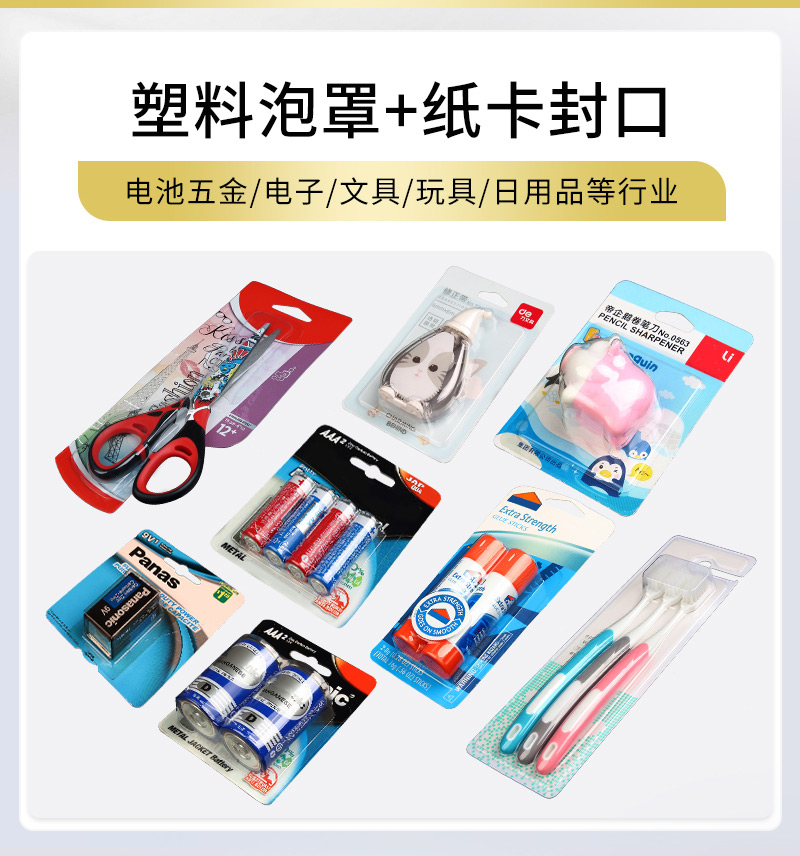 产品功能:适用于五金、电子、玩具、日用品、医疗器械等产品的吸塑与纸卡热封包装